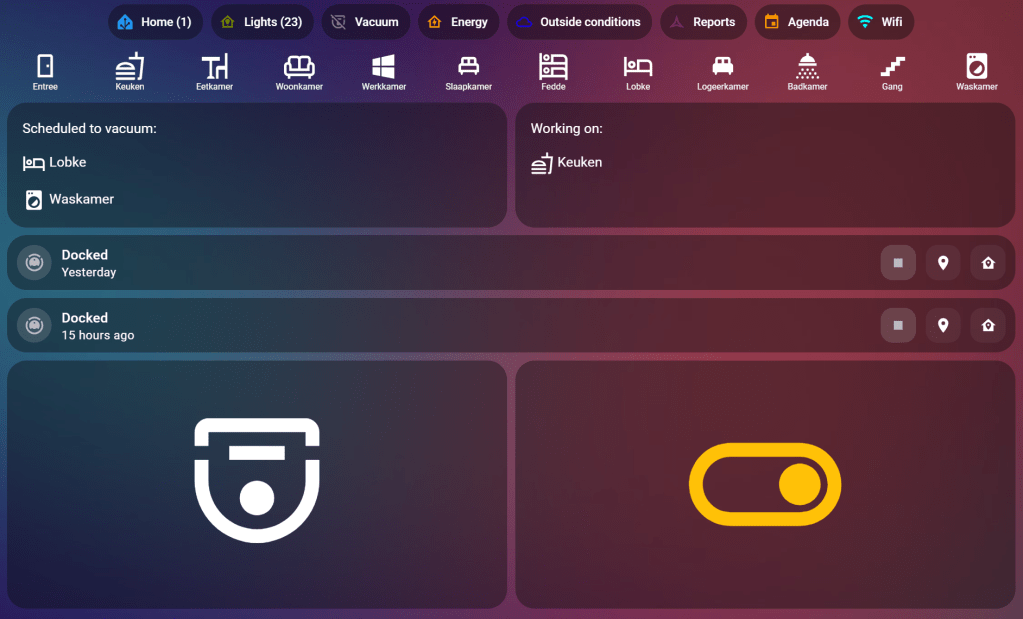 - Robot status panels: Shows the current status of my two cleaning robots.