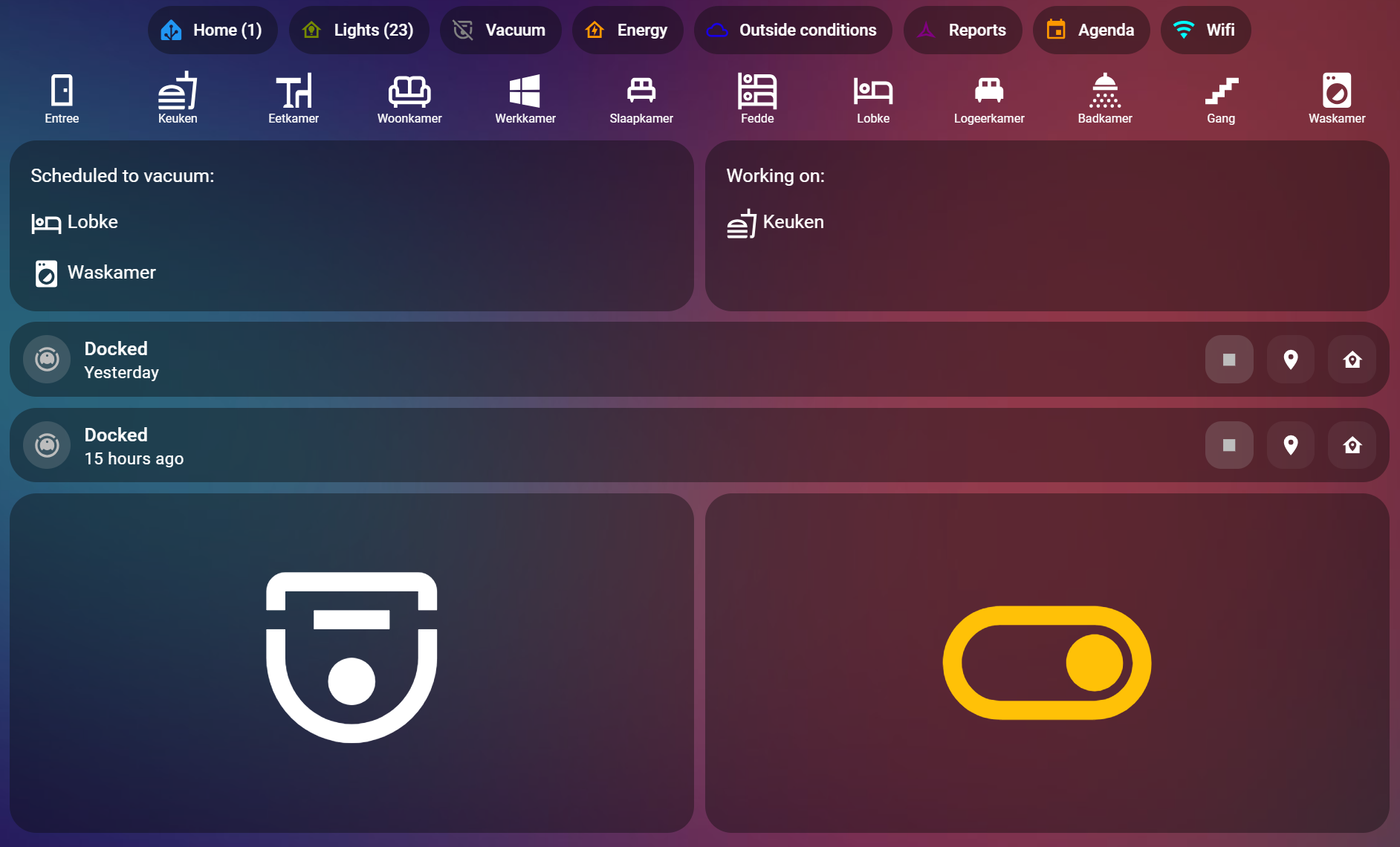 To manage the automation, I built a custom Home Assistant dashboard that acts as the control center for my vacuuming system. Here’s a snapshot of the dashboard layout: